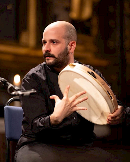 He attended and completed his studies at the Frame Drum Academy of the Festival “Tamburi Mundi” in Freiburg im Breisgau with Murat Coskun. Specialization in frame drums and other instruments (such as percussion idiophones, dulcimer, jaw-harp and various percussion keyboards) brought him closer to early and traditional music, in a constant quest to increase dialogue and ideal exchange between the various fields acquired.